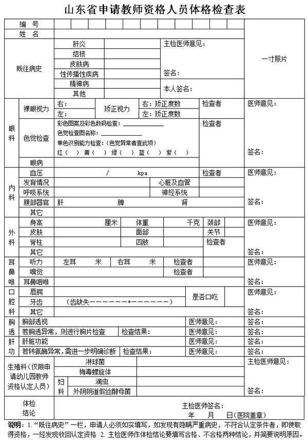 (六)适应教育教学工作需要,具有良好的身体素质和心理素质。申请人须按照《教育部教师资格认定指导中心关于调整申请认定幼儿园教师资格人员体检标准的通知》(教资字〔2010〕15号)、《人力资源和社会保障部教育部卫生部关于进一步规范入学和就业体检项目维护乙肝表面抗原携带者入学和就业权利的通知》(人社部发〔2010〕12号)要求及《山东省教师资格认定体检标准及操作规程》(鲁教人字〔2001〕22号)规定的标准和程序参加体格检查,体检结论为合格。