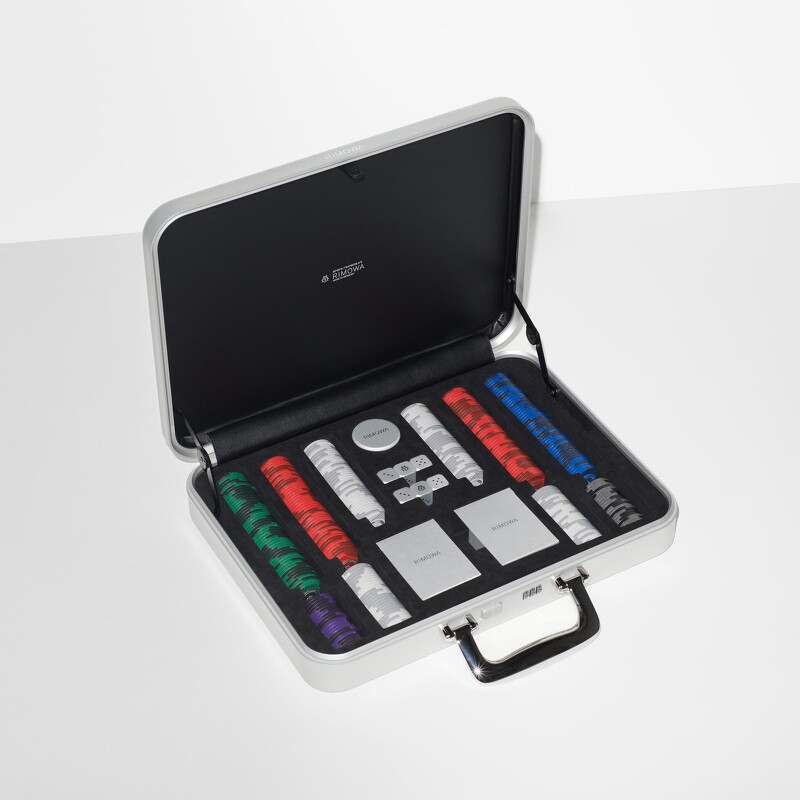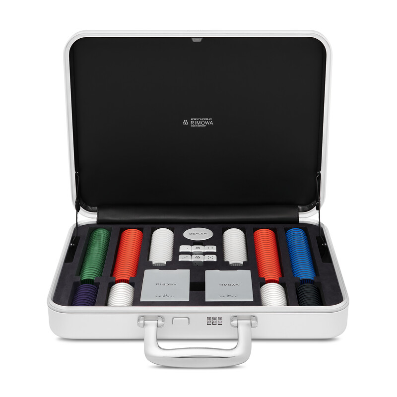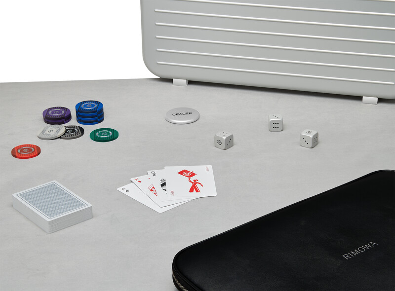 里面包含了2副扑克牌、6种不同颜色的筹码(共350片)、6颗铝镁合金製成的骰子,并适度把RIMOWA的logo点缀在不同细节部位。