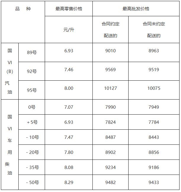2.表中所列价格为国VI标准的汽、柴油价格。