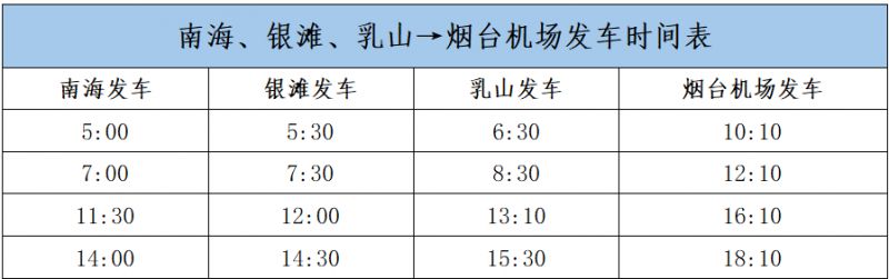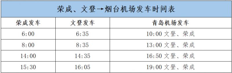 - "时刻表": - 早上:威海市区发车时间为早上6:00,之后每半小时一班。 - 下午:烟台机场发车时间为下午14:00,之后每小时一班。 - 晚上:根据航班情况,可能会有夜间加班车。