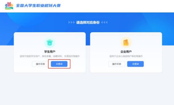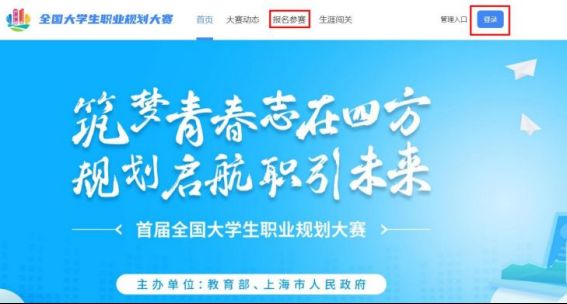 1.在全国大学生职业规划大赛(以下简称“职规赛”)官网首页处,点击“报名参赛”或“登录”进入登录页面。